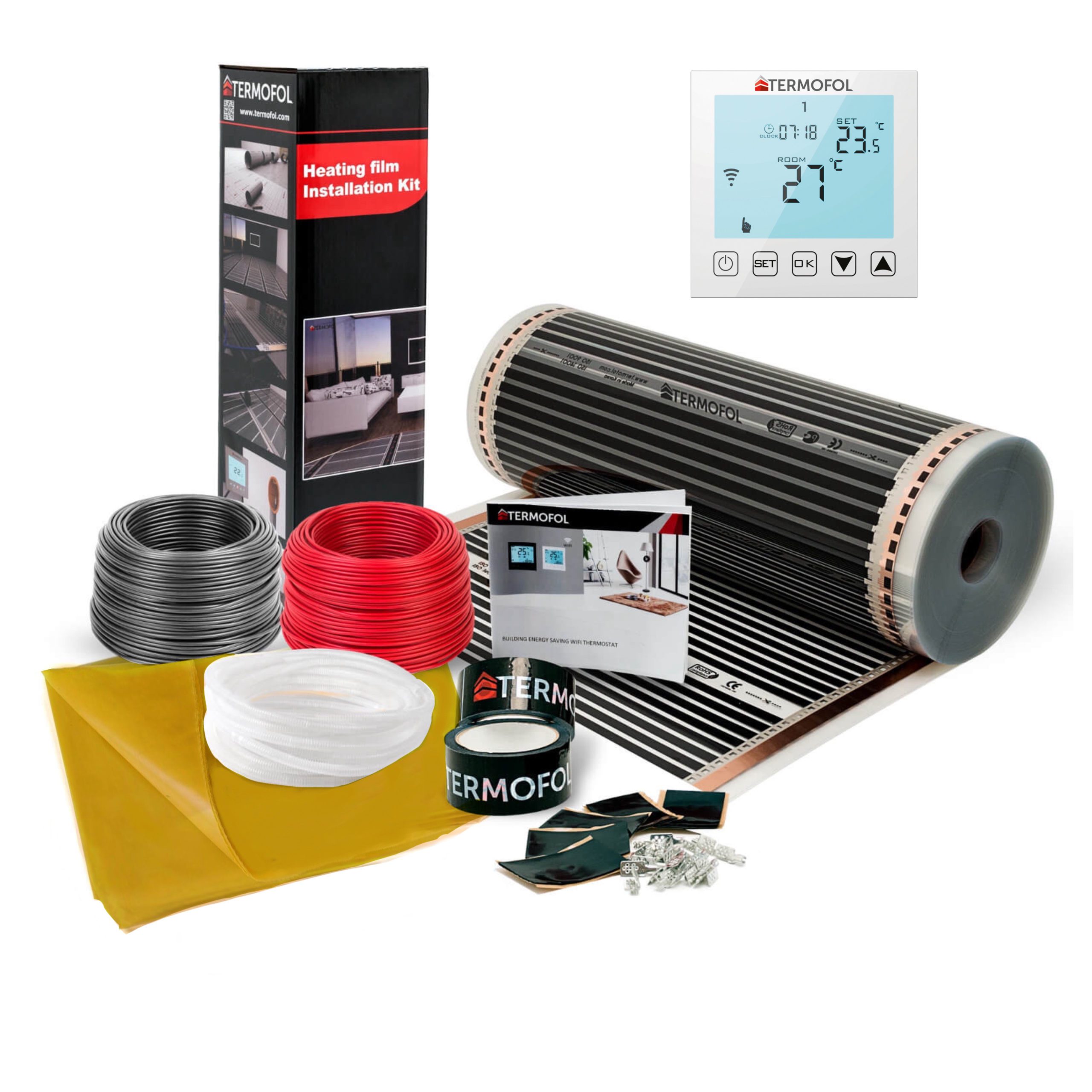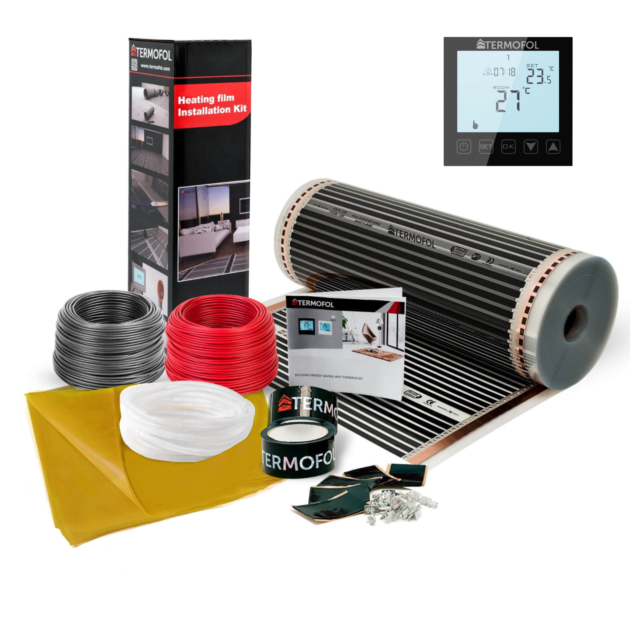 Verbindungsklebeband, Verbindungsklemmen, Elektrokabel, Butylband, Dampfsperrfolie, Schutzrohr für den Thermostatfühler (bei einer Bestellung mit Thermostat), Schritt-für-Schritt-Installationsanleitung mit Garantiekarte.